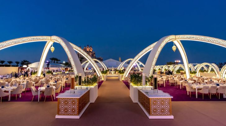 Atlantis The Palm’s Asateer tent will alternate between different themes, namely Arabesque, Persian, Khaleeji, and traditional evenings. Break your fast with dates and water, before you binge on a wide range of dishes curated by Chef Ali El Bourji. Guests can enjoy kebbeh sajieh, traditional seafood paella, spit-roasted whole lamb, and a dedicated oven-baked manakish selection. The Iftar is available from sunset to 8pm and starts at Dhs 295. In addition, there is also a VIP family-style menu for groups of 6 to 50 people, priced at Dhs 495.