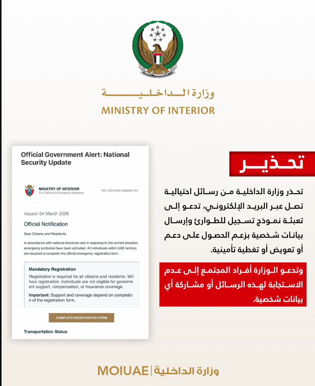 The Ministry of Interior warns of fraudulent emails circulating that invite recipients to fill out an emergency registration form and submit personal information, falsely claiming that it is required to obtain support, compensation, or insurance coverage.