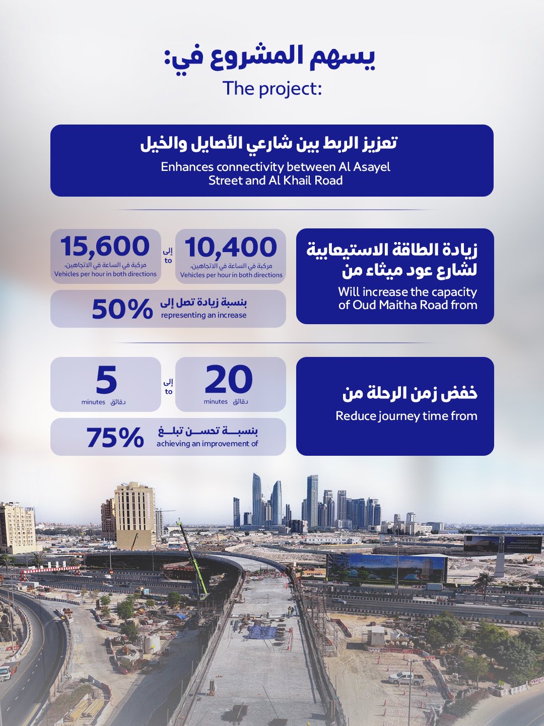 The project also includes the upgrade of the Oud Maitha Road intersection with Al Asayel Street and Al Wasl Club Street, through the construction of two bridges linking Al Asayel Street to Al Khail Road via Al Wasl Club Street. The first bridge comprises two lanes, with a capacity of 2,400 vehicles per hour, serving traffic movements from Al Asayel Street towards Al Wasl Club Street. The second bridge comprises three lanes, with a capacity of 3,600 vehicles per hour, serving traffic movements from Al Khail Road towards Al Asayel Road.