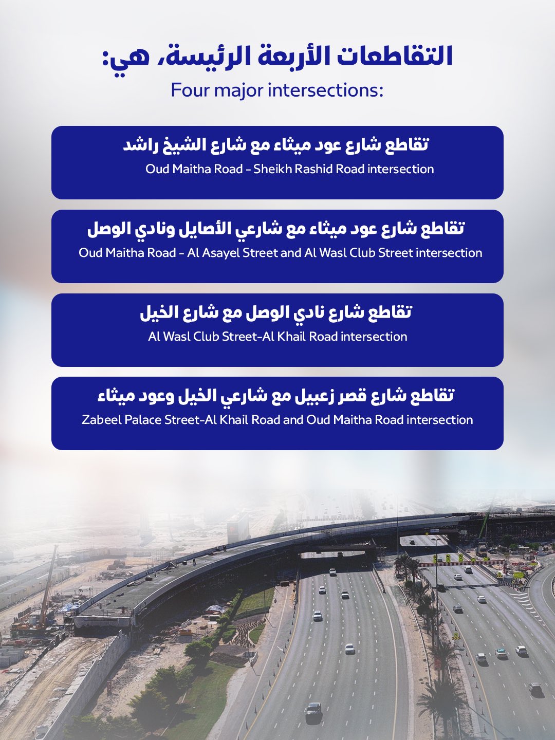 The project includes the upgrade of four major intersections, starting with the Oud Maitha Road–Sheikh Rashid Road intersection. Works include the addition of a left-turn slip ramp for traffic coming from Oud Maitha Road onto Sheikh Rashid Road towards Al Garhoud Bridge, increasing capacity to 1,800 vehicles per hour.