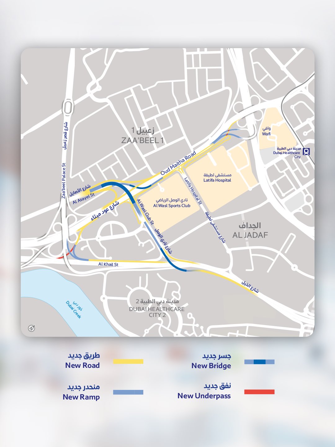 His Excellency Mattar Al Tayer further added: “The project supports a host of key service, residential, and development areas, most notably Zabeel, Al Jaddaf, Oud Maitha, Umm Hurair, Latifa Hospital, and Al Wasl Club. The project will also increase the capacity of Oud Maitha Road from 10,400 vehicles per hour in both directions to 15,600 vehicles per hour, representing a 50% increase, while reducing journey time from 20 minutes to just 5 minutes, achieving an improvement of 75%."