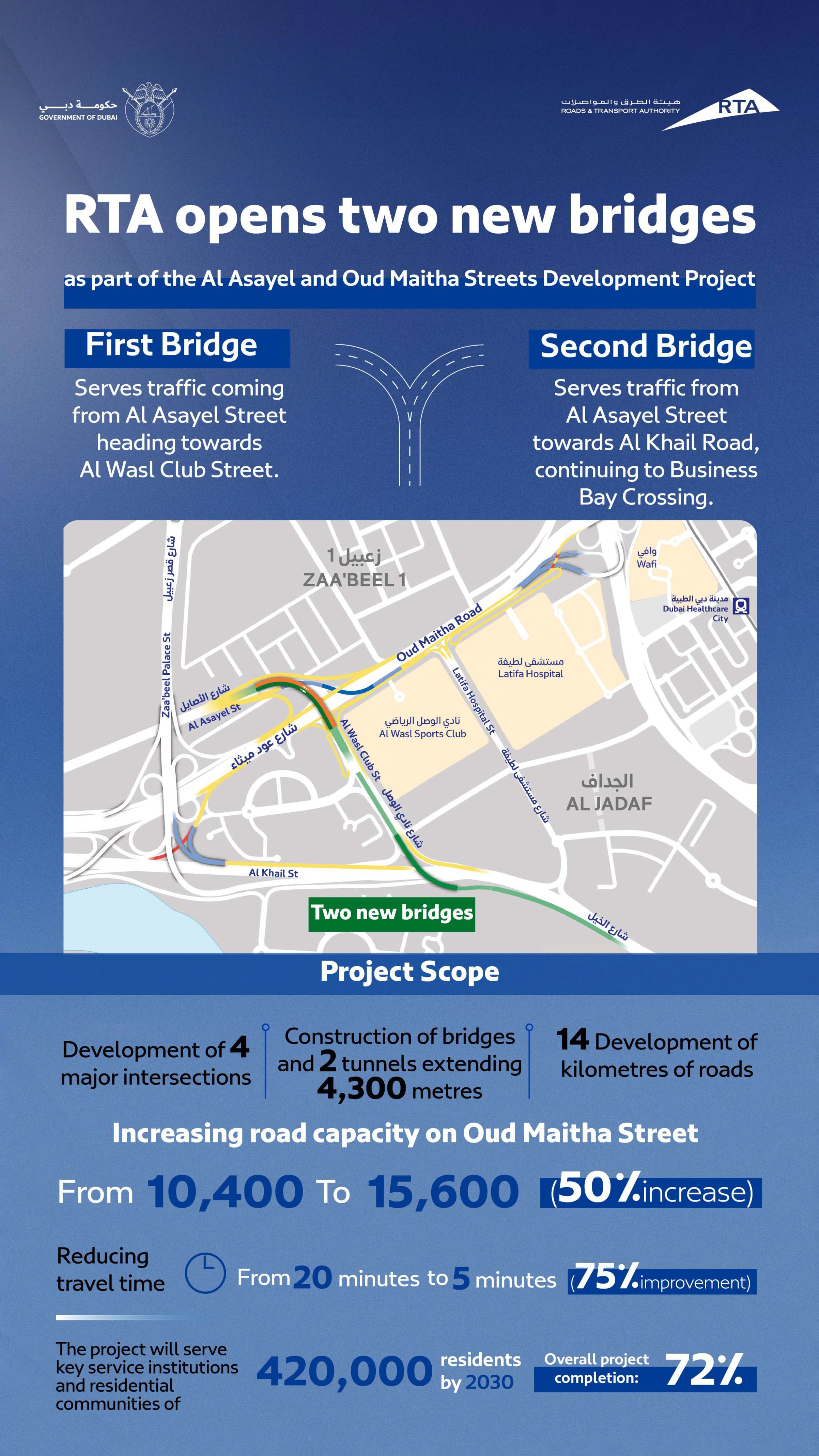 Furthermore, the project will increase the traffic-carrying capacity of Oud Maitha Street from 10,400 vehicles per hour in both directions to 15,600 vehicles per hour, representing an increase of 50%, cutting average journey time from 20 minutes to 5 minutes.